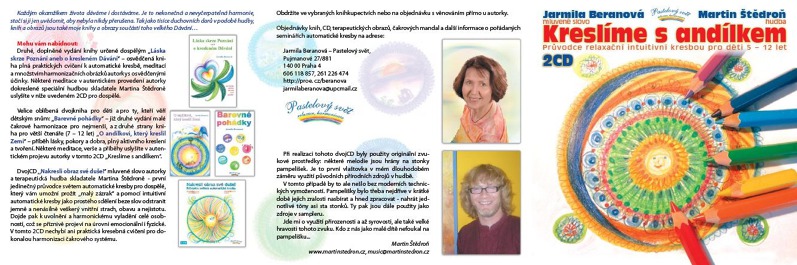 NÁDHERNÉ PŘÍBĚHY, HRÁTKY S PASTELKAMI, KRESLENÍ MANDAL - Dvoj CD "Kreslíme s andílkem" průvodce relaxační intuitivní kresbou pro děti cca 5 – 12 let, Jarmila Beranová – mluvené slovo, Martin Štědroň - hudba. SKVĚLÝ DOPLNĚK KNIHY BAREVNÉ POHÁDKY. Doporučeno nejen mateřským a základním školám, ale také všem maminkám, tátům, babičkám a dědům, zkrátka všem, kteří bdí a pečlivě střeží dětské duše a není jim lhostejná jejich budoucnost a pocity naplnění. cena 480,- Kč
