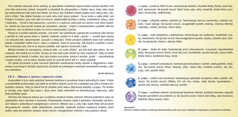 TOLIKA BYTOSTEM JIŽ UKÁZALO CESTU KE ŠTĚSTÍ ! -Dvě CD v jednom balení !!!- na druhém CD je kompletní harmonizace jednotlivých čaker mluveným slovem a speciální hudbou. Kdo chce tiše naslouchat, vytrvá, a s pokorou odevzdá své emoce ruce držící pastelku, pocítí po čase drobné, ale významné ,,zázraky". Toto unikátní mluvené slovo autorky se speciálním hudebním doprovodem zavede každého kdo chce tiše naslouchat, jemně, bezpečně a nenásilně do přirozeného a čistého stavu, který nám všem byl vlastní, cena 480,- Kč
