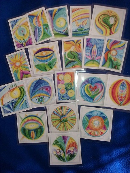 Pro ty z vás, kdo jste si oblíbili některé obrazy nebo mandaly z mojí galerie jsou tu malé kopie (zalaminované kartičky na zadní straně s poetickou legendou - mantrou obrazu). Můžete tak mít stále na očích vybranou mandalu nebo obdélníkový obrázek, který třeba již není v originále k dispozici. Tyto biorezonátory jsou vytvořeny zejména z obrazů s posledních 3 let. Budou vás provázet ve dnech všedních i svátečních v životě. cena 75,- Kč,